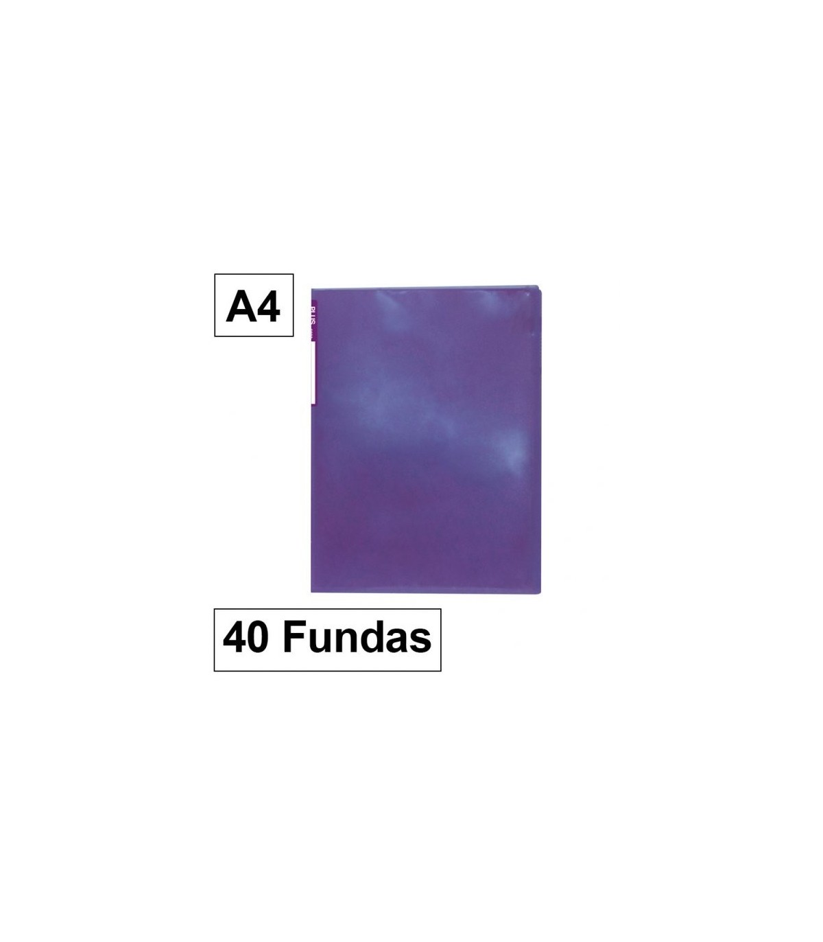 Tapas de polipropileno flexibles. Fundas transparentes de polipropileno antireflejo de 45 micras y resistentes a las fotocopias. Soldadas al lomo. 40 fundas. Color violeta. Medidas: 230 x 305 mm.