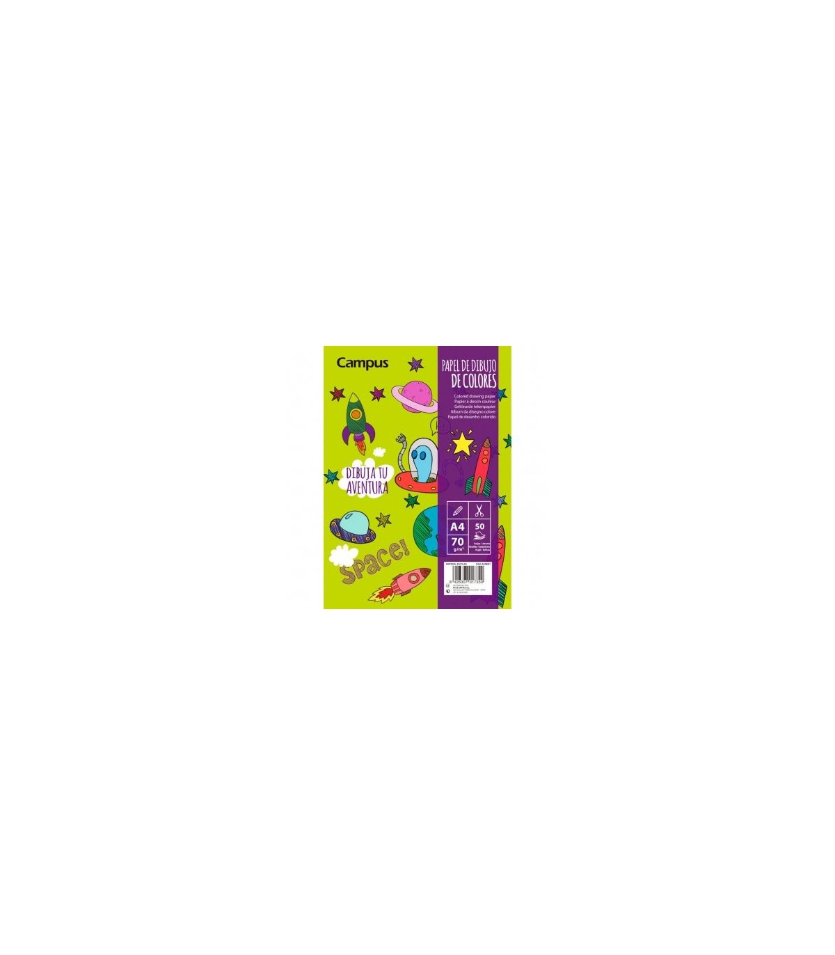 Papel de colores (azul, naranja, verde, rojo, amarillo claro y morado) de 70 g. Formato A4.