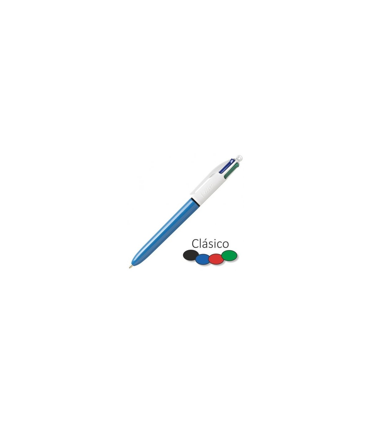 Bolígrafo 4 colores en 1. Bolígrafo recargable y retráctil de punta de 1 mm y trazo de 0,4 mm. Colores de la tinta: azul, negro, rojo y verde. Tinta a base de aceite. Secado rápido. Clip y anillo para colgar.