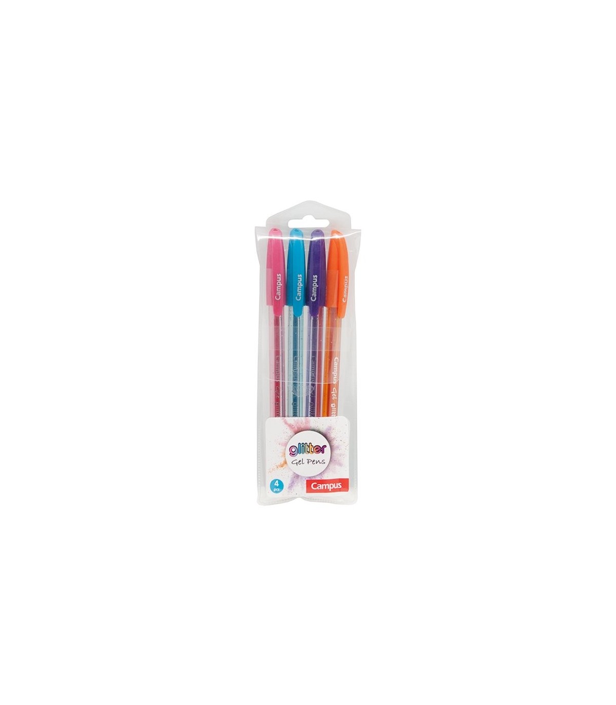 Bolsa de 4 bolígrafos de gel. Cuatro colores con tinta glitter: violeta, rosa naranja y azul. Punta de bola de 1 mm. Ancho de trazo de 0,7 mm.
