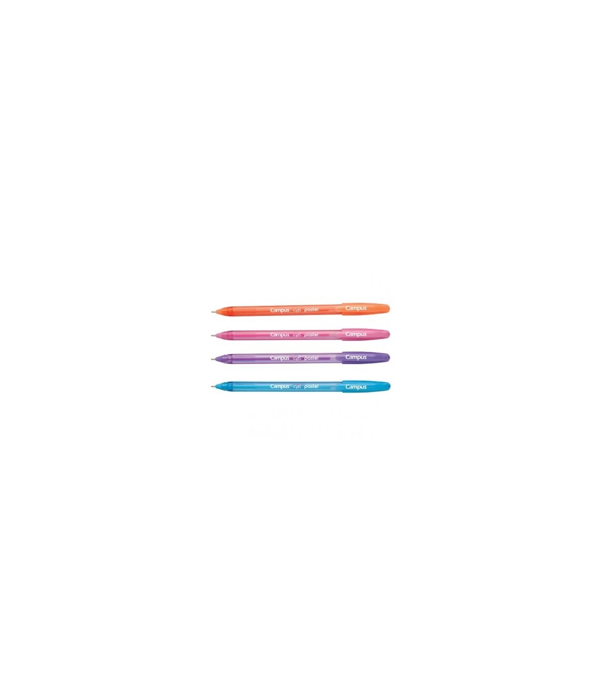 Bolsa de 4 bolígrafos de gel. Cuatro colores con tinta pastel: violeta, rosa naranja y azul. Punta de bola de 1 mm. Ancho de trazo de 0,7 mm.