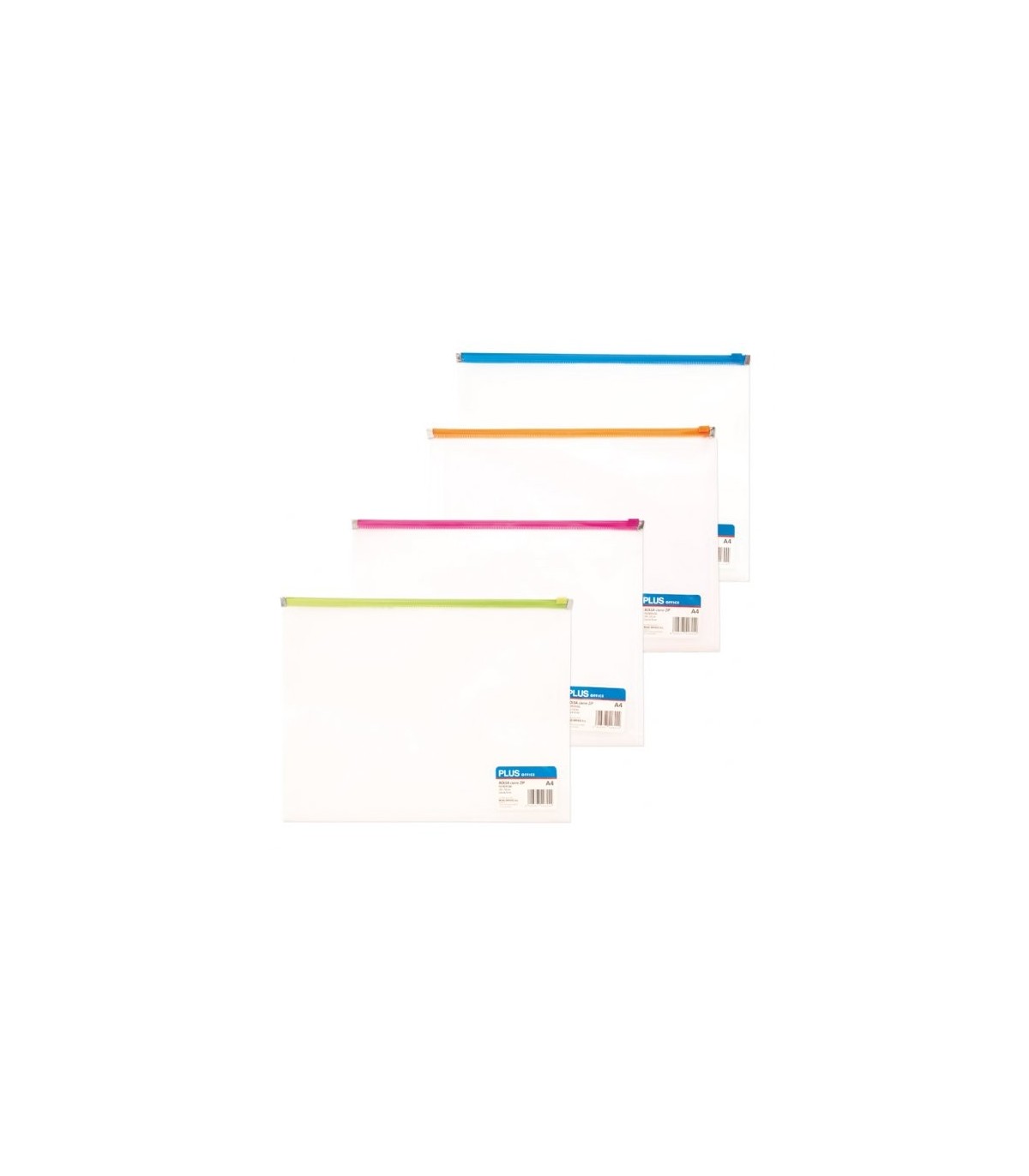 Bolsa con cierre zip fabricada en polipropileno con lomo de 3 cm. Tamaño A4. Cuatro colores: naranja, rosa, verde y azul.