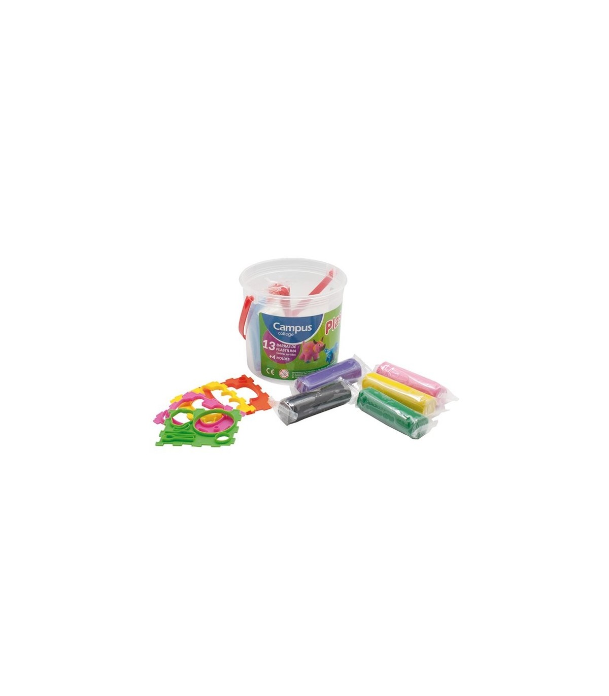 Bote de plastilina para modelar. Los colores se pueden mezclar entre sí. Apto para uso escolar. Bote con asa. Incluye 13 barras de plastilina de colores surtidos y 4 moldes con diferentes figuras. Sin gluten. 1,2 kg de plastilina.