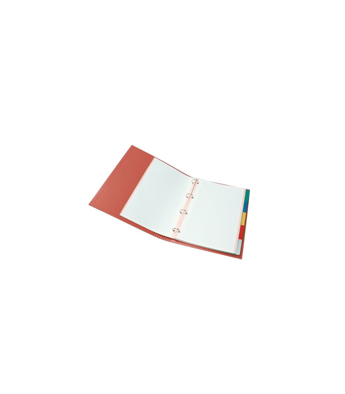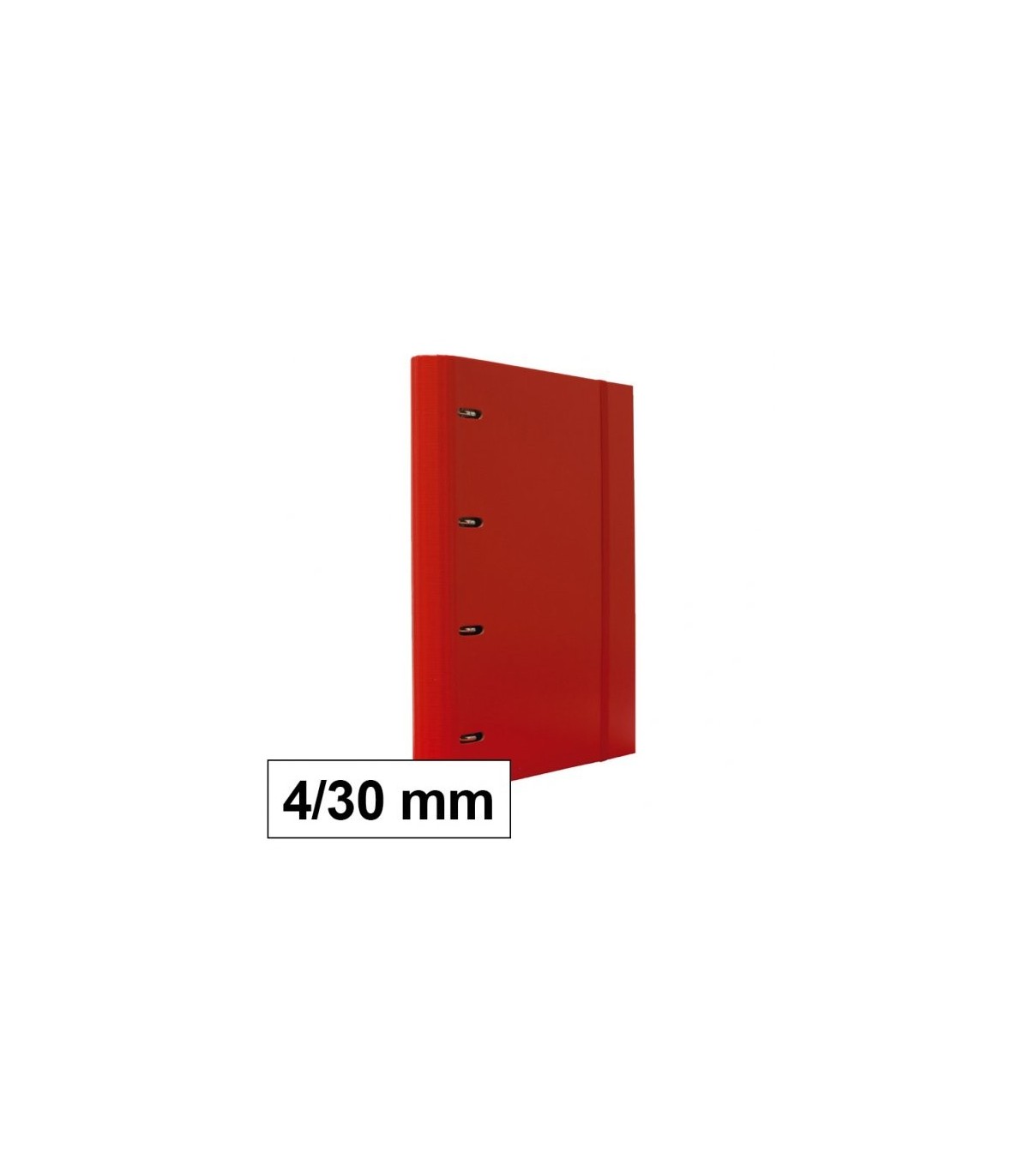 Carpeta de 4 anillas y cierre de goma. Recambio A4 con bandas de color. 100 hojas de 90 gr. Cuadrícula 5x5 mm. 5 separadores de polipropileno. 4 anillas de 30 mm. Sistema rado. Medidas: 320x250 mm. Disponible en 8 colores. Lomo ancho de 60 mm. Color: rojo.