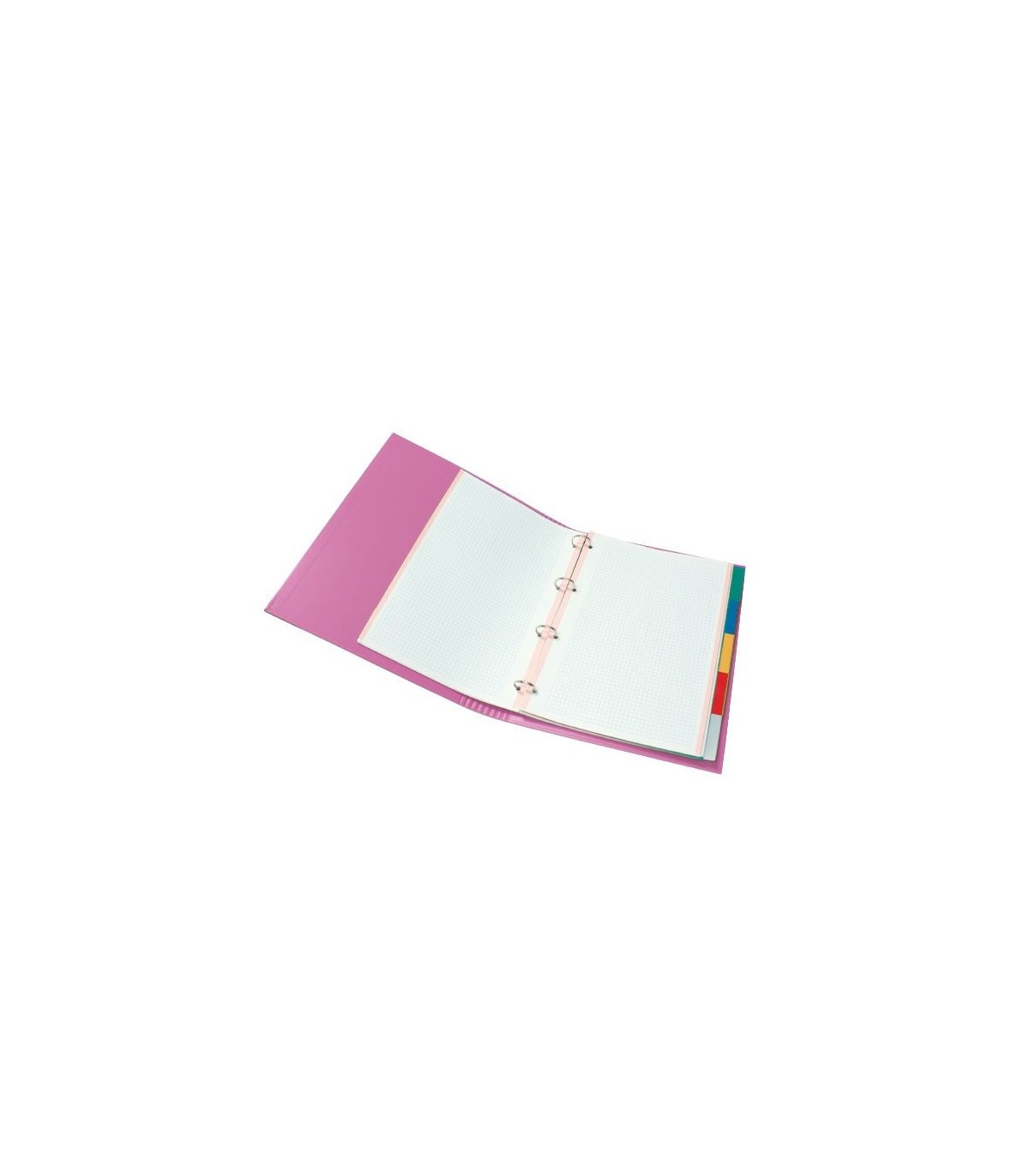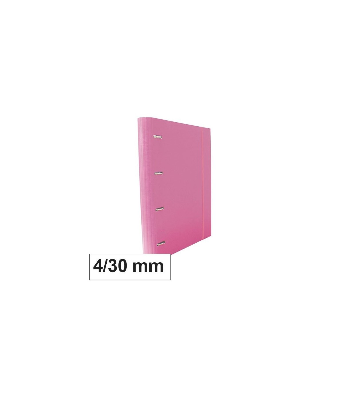 Carpeta de 4 anillas y cierre de goma. Recambio A4 con bandas de color. 100 hojas de 90 gr. Cuadrícula 5x5 mm. 5 separadores de polipropileno. 4 anillas de 30 mm. Sistema rado. Medidas: 320x250 mm. Disponible en 8 colores. Lomo ancho de 60 mm. Color: rosa.