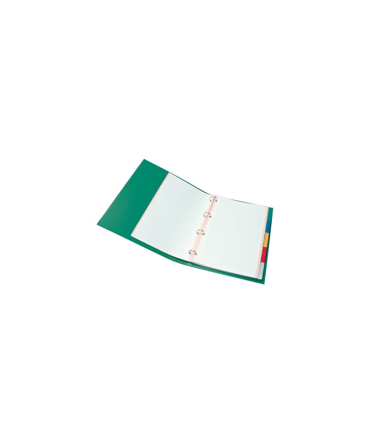 Carpeta de 4 anillas y cierre de goma. Recambio A4 con bandas de color. 100 hojas de 90 gr. Cuadrícula 5x5 mm. 5 separadores de polipropileno. 4 anillas de 30 mm. Sistema rado. Medidas: 320x250 mm. Disponible en 8 colores. Lomo ancho de 60 mm. Color: verde.