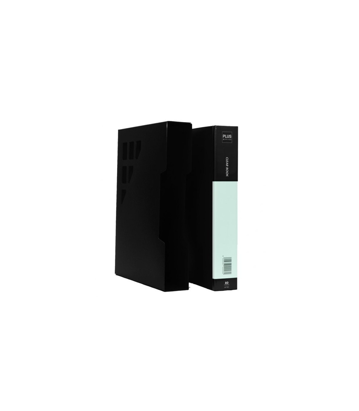 Carpeta con cajetín con lomo personalizable. Tapas de polipropileno rígido. Fundas de e polipropileno transparentes de 50 micras. Porta identificación transparente en el lomo. Medidas: 308 x 245 mm. Nº de fundas: 80. Color: negro.