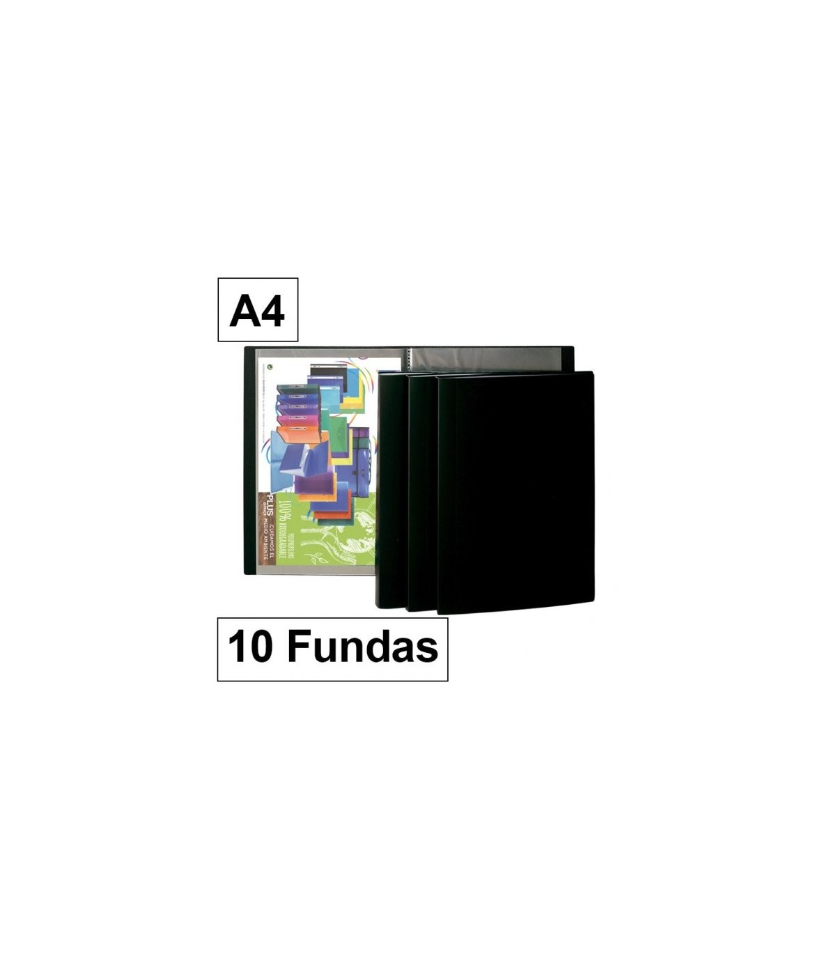 A4 Negras sin lomo. Tapas de polipropileno flexibles. Fundas transparentes de polipropileno antirreflejo y resistentes a las fotocopias. Soldadas al lomo. Color: Negro.