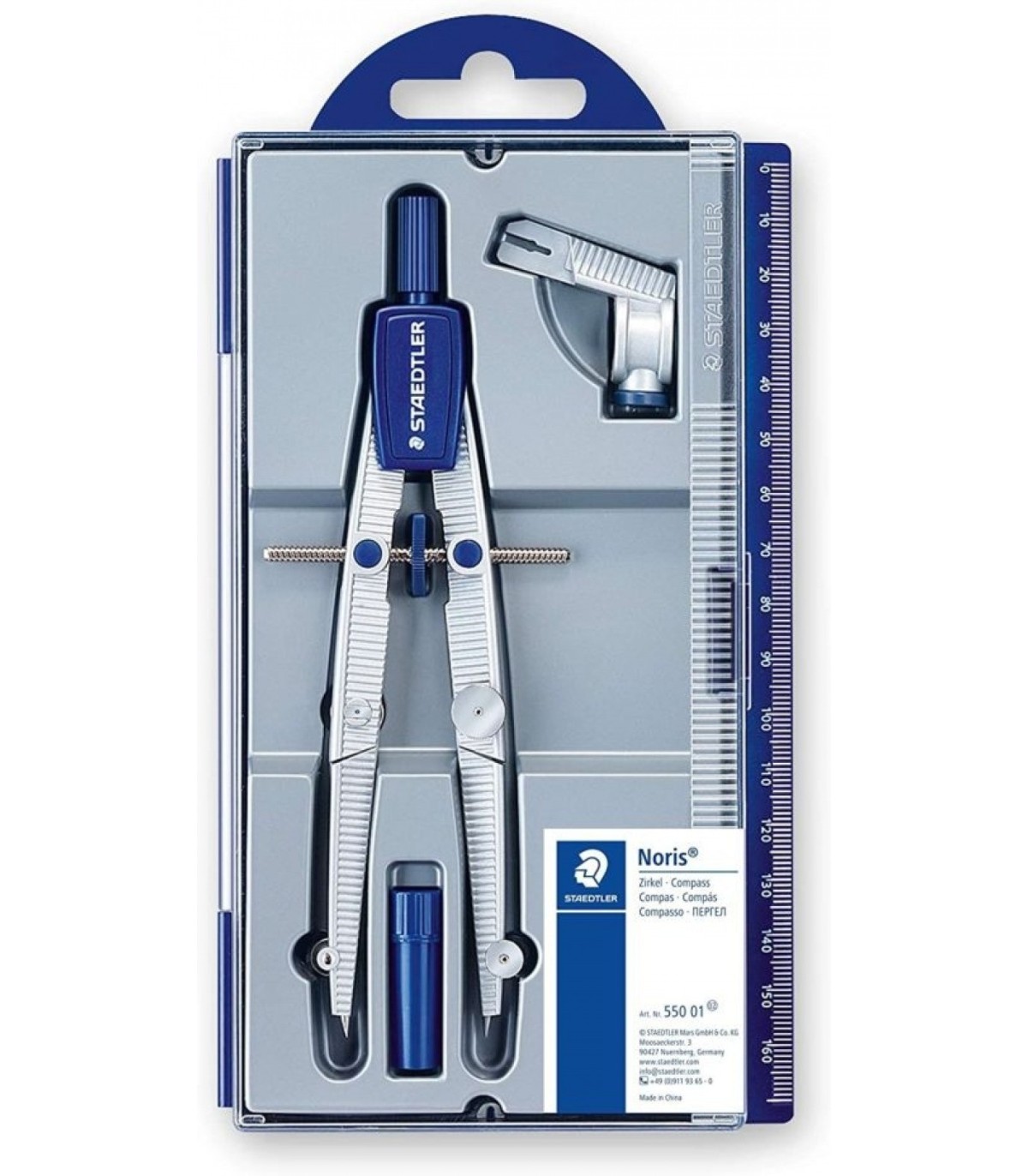 Compás escolar de precisión con rueda de ajuste central. El diámetro máximo del círculo es 26 cm y con alargadera 39,5 cm. Recomendado para uso escolar. Estuche de plástico con tapa transparente abatible con borde en forma de regla de 17 cm. con compás, tubo de minas y adaptador universal.